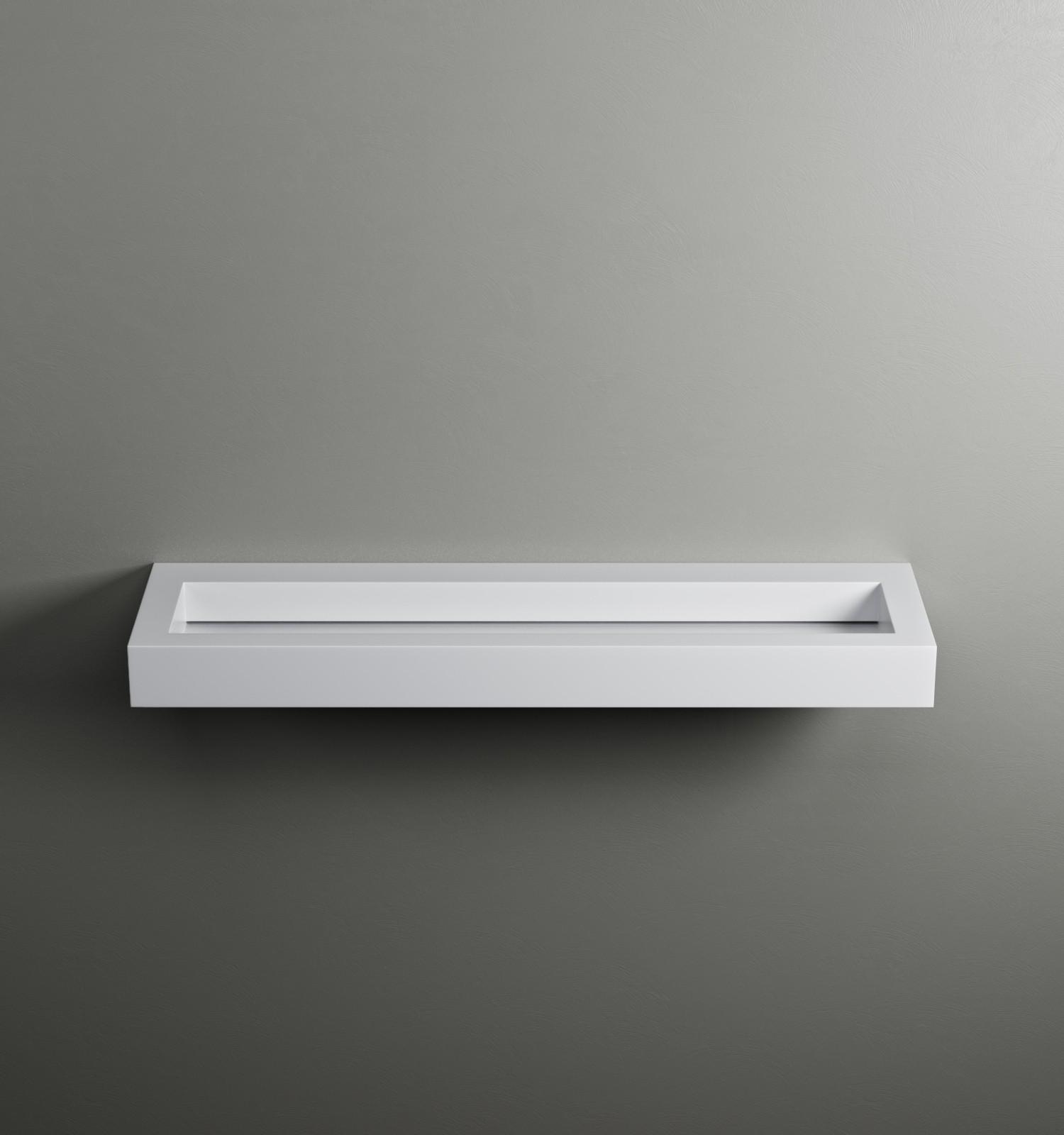 Il blocco è composto dal top con vasca integrata munito di fondo a scivolo: la fessura convoglia l’acqua verso una piletta di scarico nascosta.